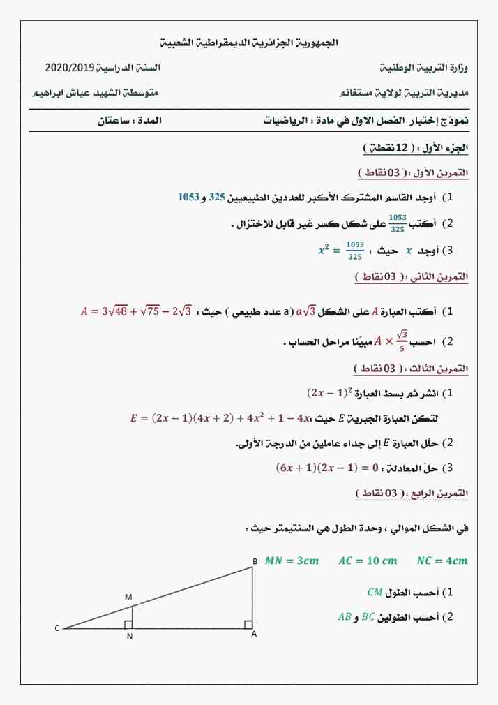 الموقع الاول للتعليم في الجزائر اختبار الرياضيات مع التصحيح للسنة الرابعة متوسط للفصل الأول