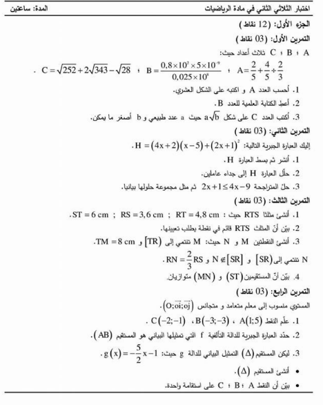 اختبار الفصل الثالث في مادة الرياضيات السنة 4 الرابعة متوسط