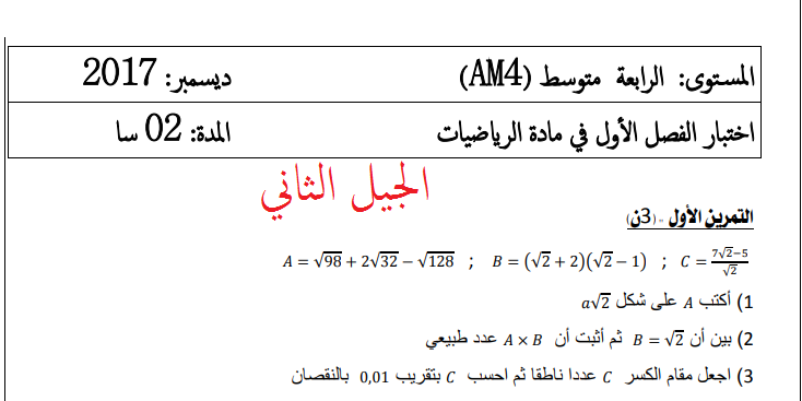 اختبار الرياضيات مع التصحيح للسنة 4 متوسط فصل 2 الجيل الثاني