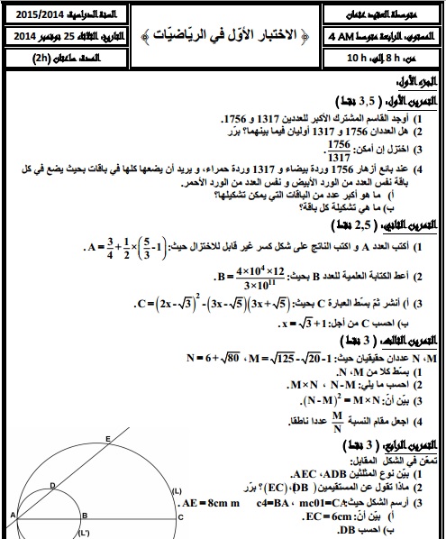 الموقع الاول للتعليم في الجزائر اختبار الثلاثي الاول في الرياضيات للسنة الرابعة متوسط