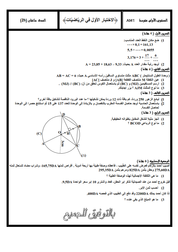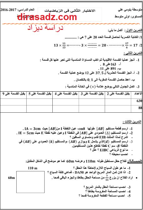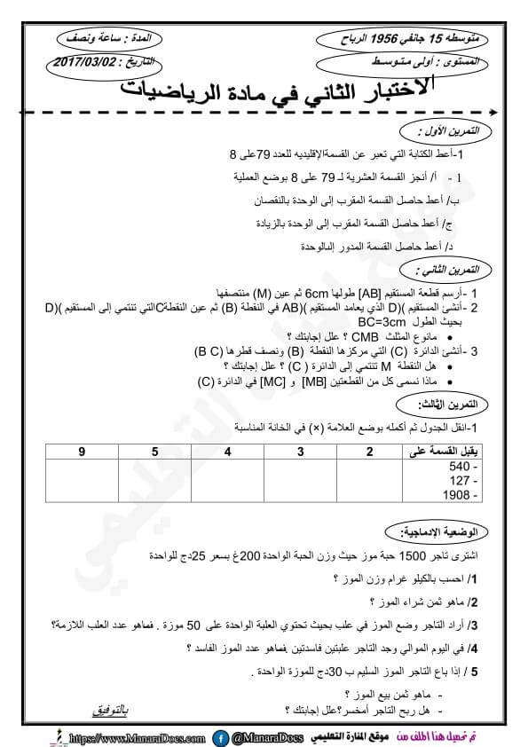 الاختبار الثاني في الرياضيات للسنة الاولى متوسط