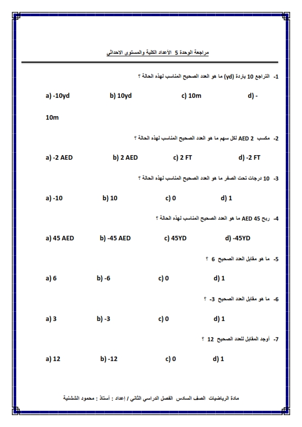أوراق عمل الأعداد الكلية والمستوى الإحداثي في الرياضيات المتكاملة للصف السادس الفصل الثاني